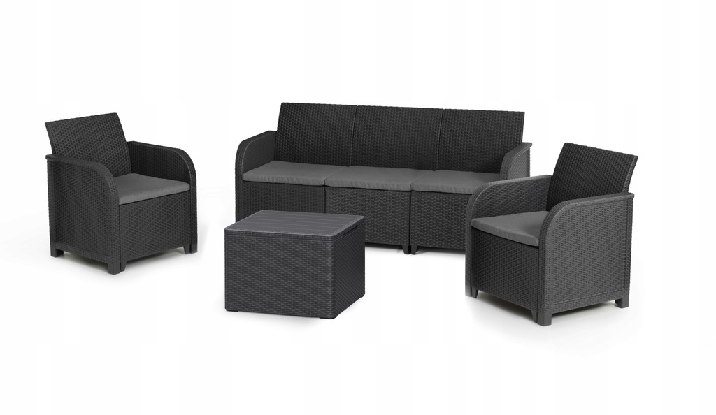 Komfortowy 5 osobowy komplet mebli Rosali z zaokrąglonymi podłokietnikami i stołem z dodatkową funkcją przechowywania to idealne zastosowanie do ogrodów, balkonów, tarasów.   Nawet w ograniczonej przestrzeni z zestawem rattanowym Rosali można stworzyć wymarzone miejsce wypoczynku na świeżym powietrzu. Dzięki unikalnej konstrukcji przed dokonaniem montażu, możesz wybrać jedną z dwóch dostępnych konfiguracji.  Wszystkie potrzebne części znajdują się w kartonie z 3 osobową sofą, dwoma fotelami i stołem.